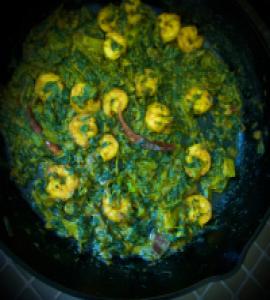 Large shrimp marinated in honey, vinegar, & spices, cooked w/ lentils, a sweet & sour taste.